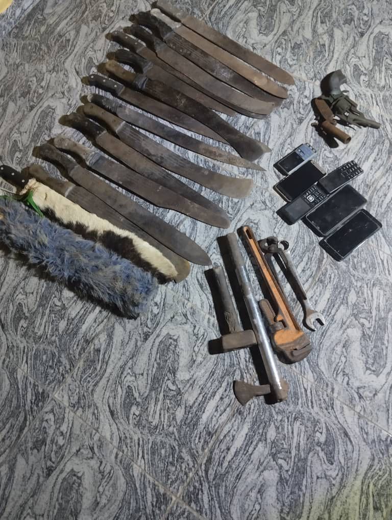 ‘‘A comprehensive search led to the recovery of the following items from the suspects : one locally made pistol, one locally made revolver pistol, 16 machetes, six mobile phones, two big generators, one battle axe and one plier and other incriminating items.’’