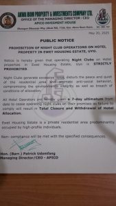 The Akwa Ibom Government has ordered the closure of night clubs and brothels operating in hotels and private locations within the upscale Ewet Housing Estate (EHE) in Uyo.