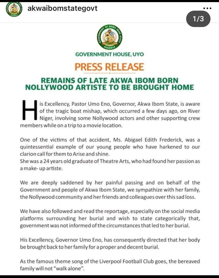 His words, “His Excellency, Pastor Umo Eno, Governor, Akwa Ibom State is aware of the tragic boat mishap which occurred a few days ago on River Niger involving some Nollywood Actors and other supporting crew members while on a trip to a movie location.”