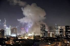 State TV said 60 people were believed to have been killed there, though the figure was not officially confirmed. It broadcast pictures of the aftermath, with the collapsed building flattened into debris and the façade of several upper storeys lying sideways in the street, while slabs of concrete dangled from a neighbouring building.